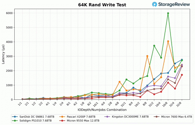 কিংস্টন DC3000ME এবং সানডিস্ক DC SN861 মাঝারি পরিসরে পড়েছিল, সাধারণত 0.05ms এবং 2.7ms এর মধ্যে বিলম্বের সাথে, শালীন ভারসাম্য সরবরাহ করে তবে মাইক্রোনের নির্ভুলতার সাথে মেলে না।Pascari X200P এবং Solidigm PS1010 সবচেয়ে উল্লেখযোগ্য অস্থিরতা দেখিয়েছে, যথাক্রমে ৪.১ এমএস এবং ৬.০ এমএস, উচ্চতর সারি গভীরতায়।
