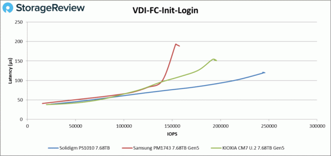 VDI FC ইনিশিয়াল লগইনের জন্য, PS1010 আবার সেরা পারফর্মিং ড্রাইভ ছিল (একটি বড় ব্যবধানে), 119.8µs এ 246K IOPS সহ। পরবর্তী সেরা ড্রাইভ ছিল KIOXIA, যা 151µs লেটেন্সিতে প্রায় 200K IOPS পোস্ট করেছে।